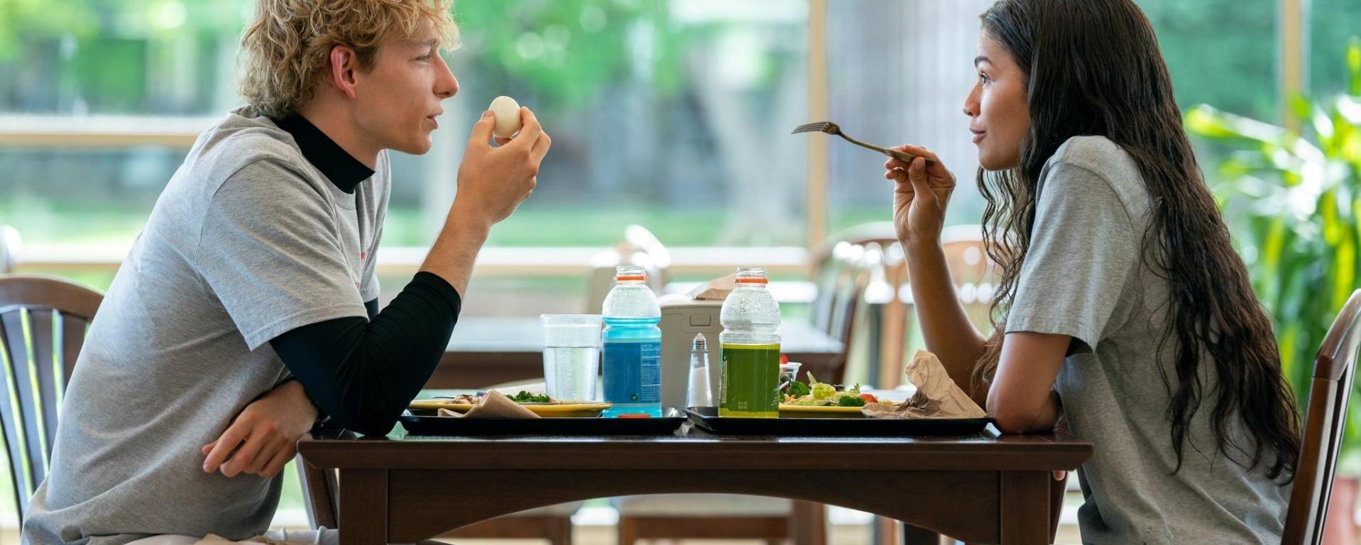 Non manca ovviamente lo sguardo queer di Guadagnino: fuori dal match climatico, le scene più memorabili con i due protagonisti sono anche quelle sessualmente più suggestive. Una scena nella mensa, dove mangiano scherzosamente dei churros, e una successiva più rancorosa, dove i due si confrontano in una sauna. C’è un’enfasi quasi camp delle dinamiche sessuali, che viene enfatizzata dallo stile di ripresa, con angolazioni inaspettate.