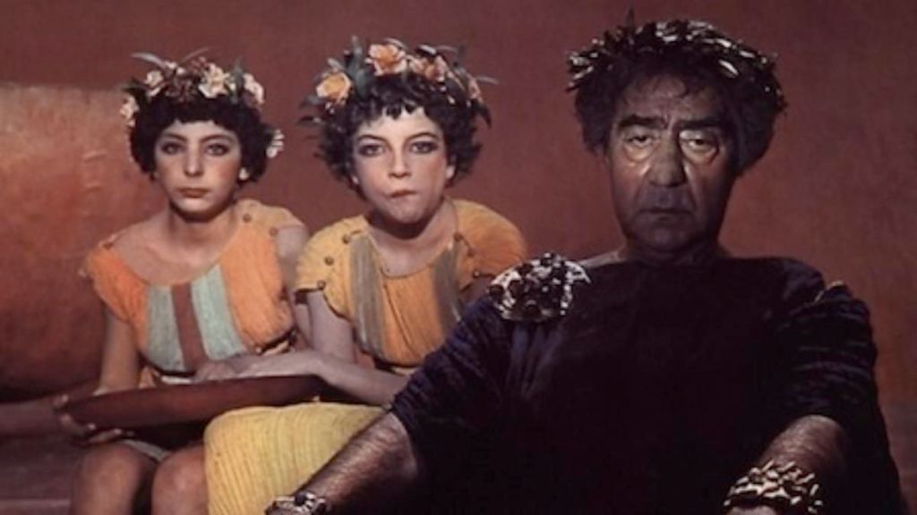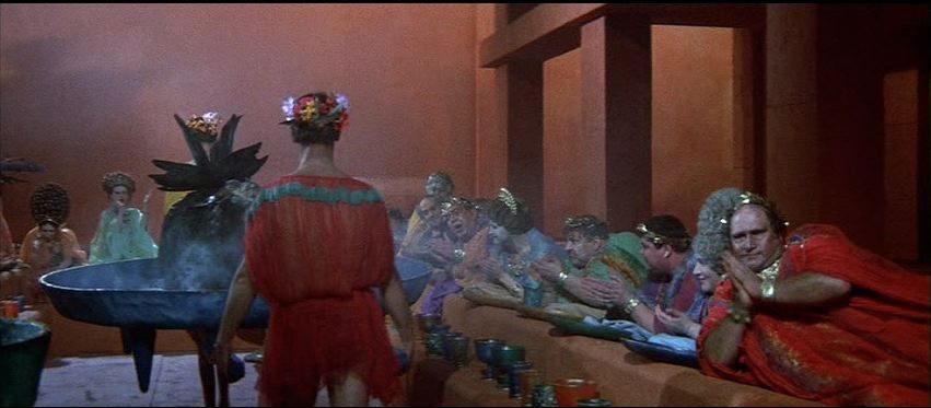 Encolpio come un 68ino si affaccia al mondo ed è alla ricerca della sua virilità, dono che solo la dannata Enotea, da lui definita “madre Generosa” può ridargli. Eppure l’occhio non può non cadere sul grande banchetto di Trimalcione, schiavo diventato liberto alla disperata ricerca di approvazione da parte della classe alla quale ormai appartiene, che avviene subito dopo il terremoto, tra fiamme infernali, uomini in gabbie che saltano come scimmie, cittadini agiati che si rilassano e schiavi che sgobbano, abluzioni in piscina (un atto volto a purificarsi, ma da cosa?) e addirittura un finto funerale del padrone di casa non possono non far pensare a un forte attacco al capitalismo e alla cultura dell’ostentare. Un banchetto dove i vermi escono dal maiale e viene pronunciata la frase “Meglio impiccare un marito morto che perdere un amante vivo” rappresenta il non velato crollo delle certezze che ci rendono tali come civiltà. I personaggi femminili nel film di Fellini (come anche in Petronio), lontani dall’idea della uxor ligia al dovere casalingo, sono macchiati di peccato e malizia, svendono spesso costrette la loro carne e si dedicano a crogiolarsi nel lusso dell’alta società con tutte le sue ambiguità. Ancora una volta un altro capovolgimento degli archetipi.